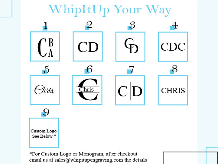 Please enter all customization details in the below Special Instructions field or email them to us at sales@whipitupengraving.com